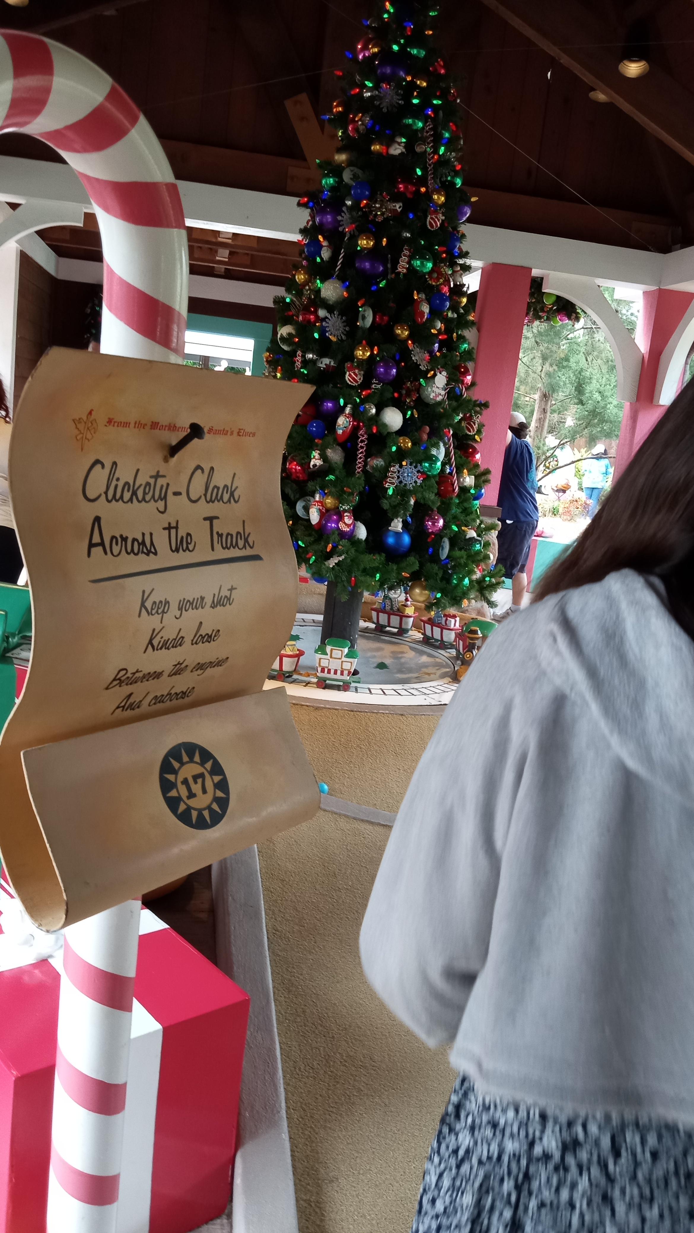트리 밑에 있는 기차는 계속 빙빙 돌며 공을 방해한다